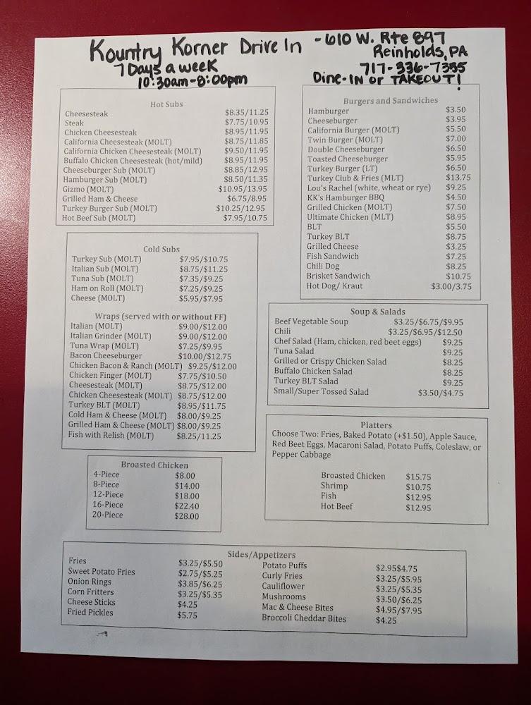 The menu at Kountry Korner Drive-In features an array of comfort foods. Signature dishes include succulent fried chicken and satisfying burgers. They offer breakfast, lunch, and dinner options to cater to all meals of the day.